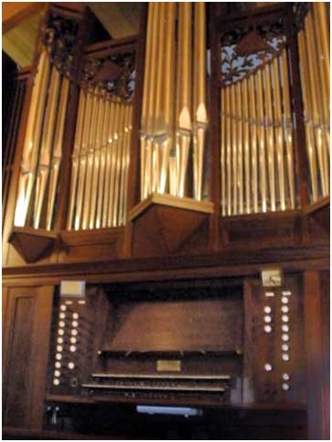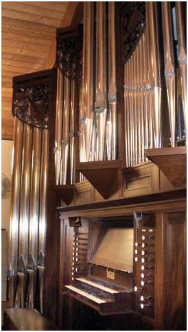 The free-standing case of St. John's new Walker organ serves to focus and project the sound, for a musical, as well as visual, purpose. Designed by Walker's architect David Graebe, it is made form Brazilian mahogany. The case pipes are made of tin mined in Thailand. Derek Riley hand carved the shades at the tops of the case pipes. These decorative items depict the instruments of praise from the 150th Psalm and also function to help mix and filter the sound that emerges.