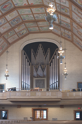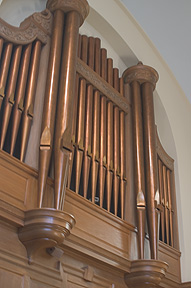 The gallery instrument contains forty-one stops in four divisions. The uppermost division is the Great, placed so its sound can best travel into the room to support congregational singing. The Positiv – located in the center, just below the Great – contains more delicate and spicy sounds, such as the Trompette-en-Chamade, a brilliant trumpet stop. The Swell division is directly below the Positiv. Its pipes are enclosed behind swinging shutters, which control the loudness of the sound reaching the listener. The Pedal division embraces the organ on both sides with its Principal 16’ of solid tin in front. The key desk has been placed a comfortable distance away from the case to allow the player to hear better and be seen by the choir. The keys are made from ebony and rosewood. The key action is the time honored mechanical (tracker) action in which there is a direct mechanical linkage from the player’s fingers to the valves that feed the pipes.