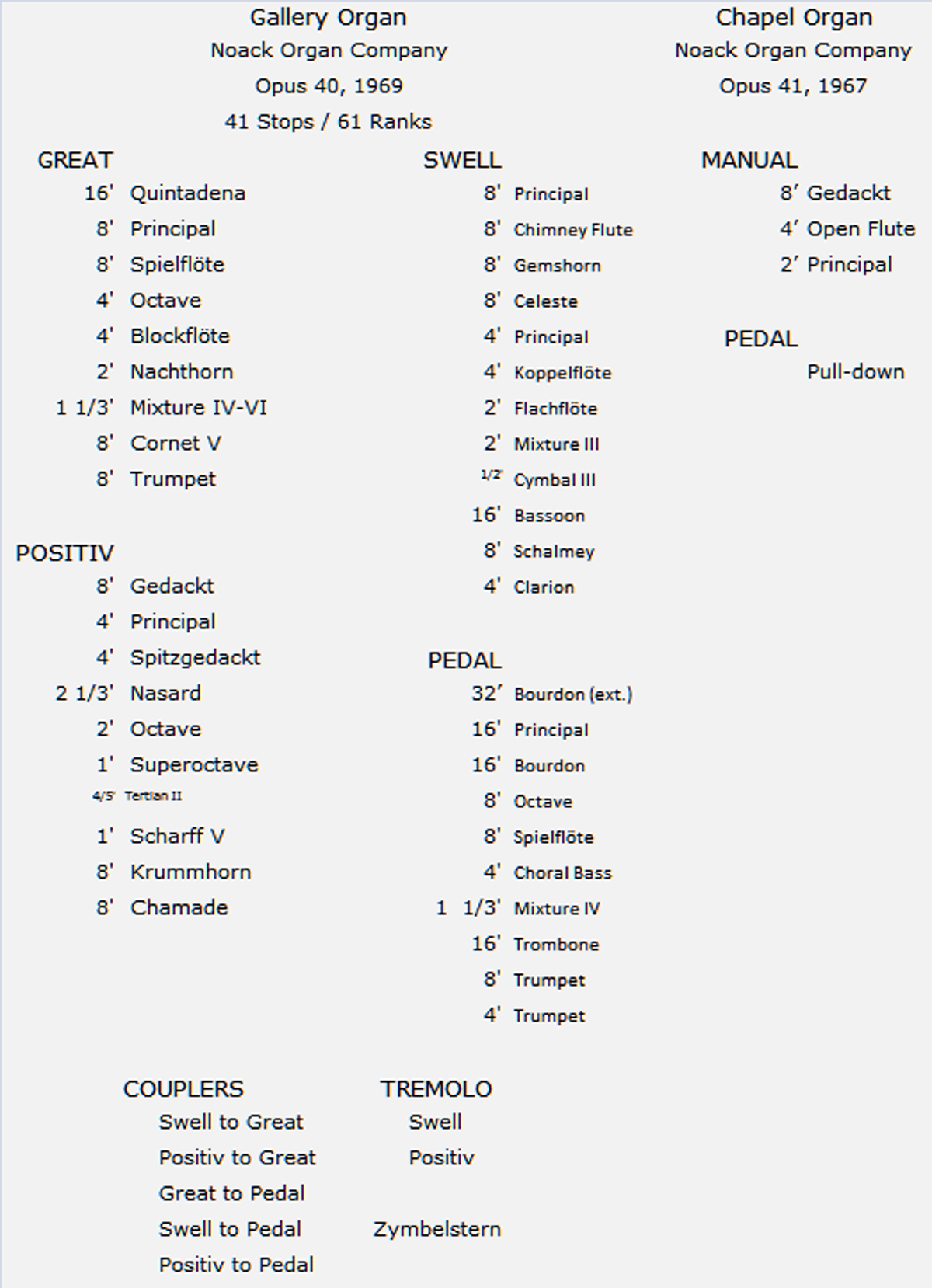 Trinity’s gallery and chapel organs were built by Noack Organ and Company of Georgetown, Massachusetts, the chapel instrument dedicated in November, 1967 and the Nave organ dedicated in March, 1969.